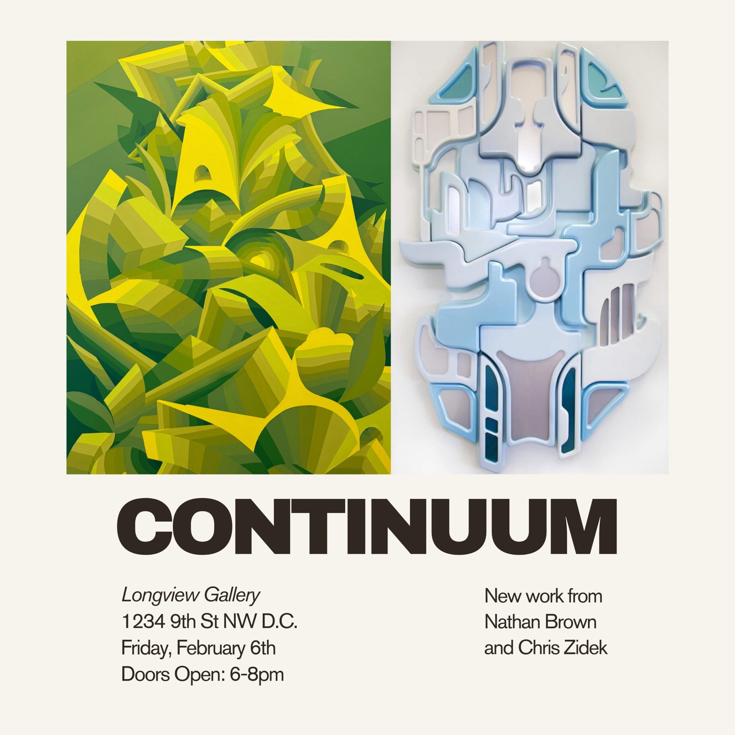 “Continuum”Longview Gallery, Washington D.C.Opening date: February 6, 6:00 - 8:00 PM Featuring: Chris Zidek & Nathan Brown Continuum explores abstraction as a state of constant transition. Working acrosssculpture and...